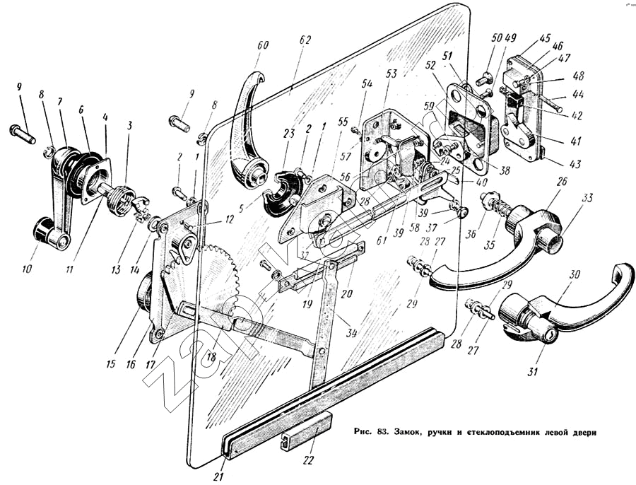 Замок, ручки и стеклоподъемник левой двери